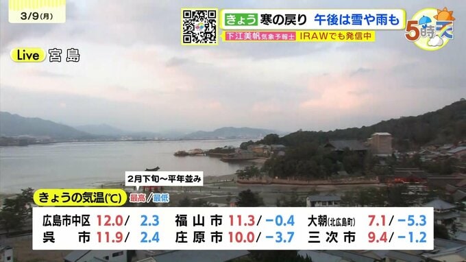 きょう3月9日(月)の広島県内は、朝はよく晴れていましたが次第に天気は下り坂で午後は不安定な空模様になりました。最高気温は、広島市中区で12.0℃ 呉11.9℃など、2月下旬から平年並となりました。