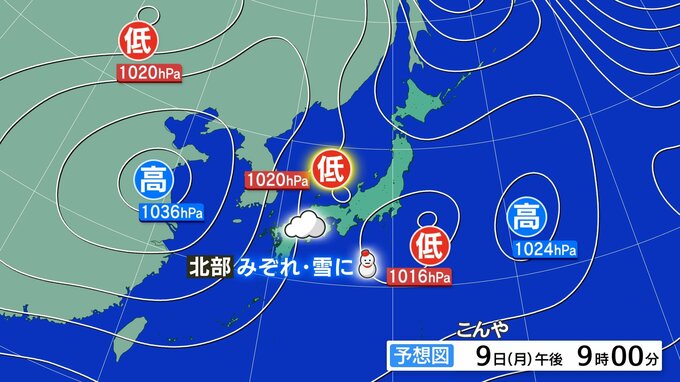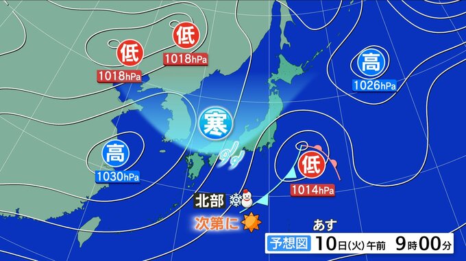 日本海を低気圧が東進し、上空には一時的に強い寒気が流れ込みます。こんやからあす朝まで、北部を中心に雪やみぞれが降り、山地では積雪する見込みです。特に峠越えの予定がある方は、冬用タイヤの確認をお願いします。南部にも一部雪雲が流れ込む可能性があります。南部では午前中雲が広がりやすいですが、午後は高気圧に覆われよく晴れるでしょう。