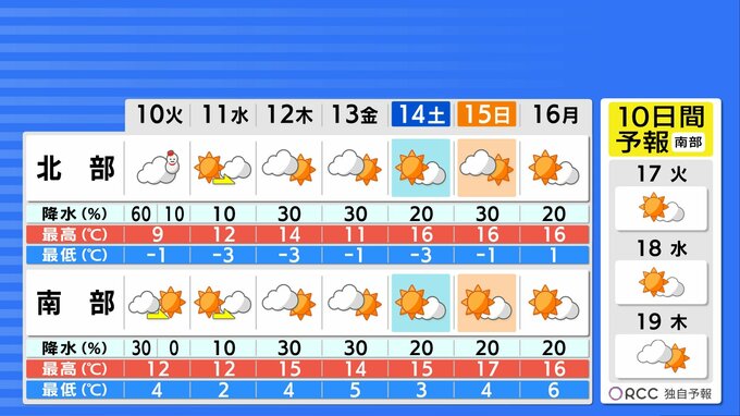 しばらく日差しの届く日が続くでしょう。水曜日頃までは冬の寒さですが、週後半は再び気温が上昇し、春らしい陽気が戻ってくる見込みです。寒暖差が大きくなるため体調管理にはご注意ください。また、スギ花粉の飛散がピークを迎えています。引き続き万全の対策が必要です。