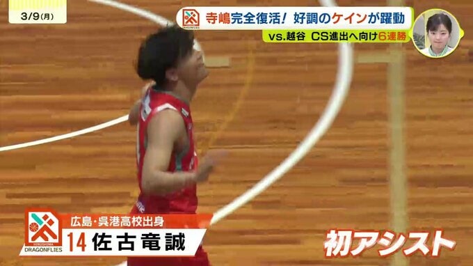 広島ドラゴンフライズが不屈の6連勝!18点差を跳ね返した「覚醒」のケインと「完全復活」の寺嶋が魅せた逆転劇 CS進出へ 2026年3月9日(月) 22:11 スポーツ また、寺嶋良選手も完全復活を印象付けるプレーを披露。 わずか約2分間のうちに4本の3ポイントシュートを連続で沈め、今季最多の18得点をマークしました。 試合最終盤には、地元・広島出身の佐古竜誠選手がホーム戦デビューを果たし、初アシストを記録。