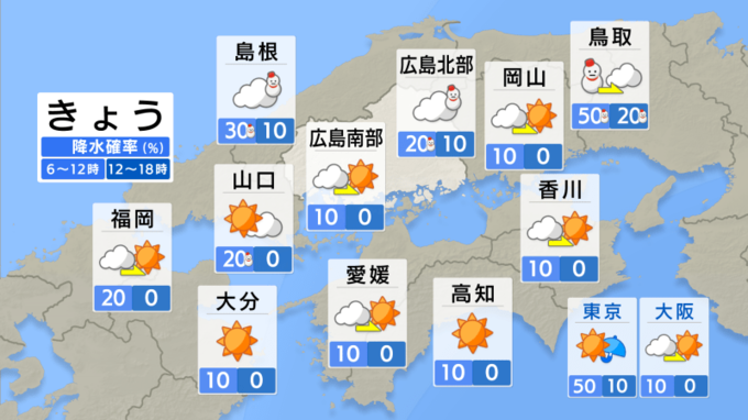 けさ(10日朝)の広島県内は、南部で青空が広がっています。北部では、明け方にかけて雪が積もりました。北広島町八幡で9センチ・庄原市高野で8センチを観測しています。朝の冷え込みはきのうより弱く、最低気温は、広島市中区4.1℃・福山市0.2℃・庄原市-1.3℃でした。