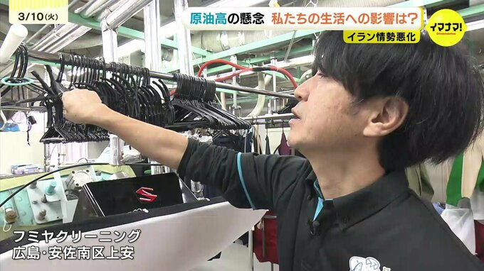 広島市安佐南区上安のクリーニング店では、すでに石油由来のハンガーなどが今後値上がりするという話が、仕入れ業者から来ています。クリーニングに欠かせないハンガーや衣類を包むビニールカバー、洗浄に使う溶剤などは全て石油由来です。物価高の影響で、ことし1月にハンガーなどの値上げ通知が来たばかりでした。