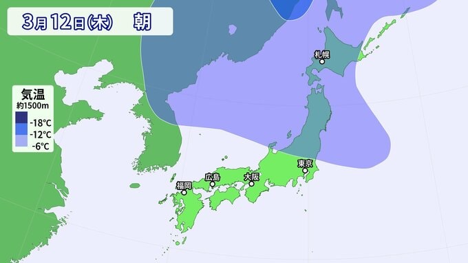 12日(木)夜からは、寒気が強まる見込みです。上空1500m付近には、平地で雪を降らせる目安の-6℃以下の寒気が南下し13日(金)夜には、広島県をすっぽり覆う予想です。北部では、12日(木)夜から13日(金)は雪が降り、山沿いでは積もるところもあるでしょう。