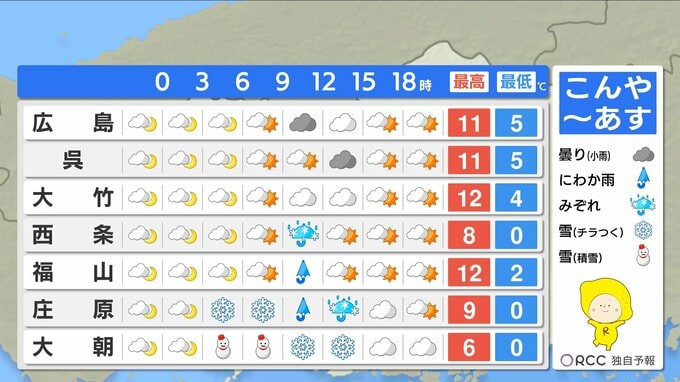 【あす3/13(金)広島天気 】不安定な空模様 北部中心に雪やみぞれ 南部晴れ間 北風冷たく冬の寒さ 2026年3月12日(木) 19:02 国内 天気 北風強く冬の寒さ 防寒対策万全に あすは冬の寒さに逆戻りします。北風が強く、数字以上に寒さを感じるでしょう。ダウンなどの冬物が活躍しそうです。暖かくしてお過ごしください。