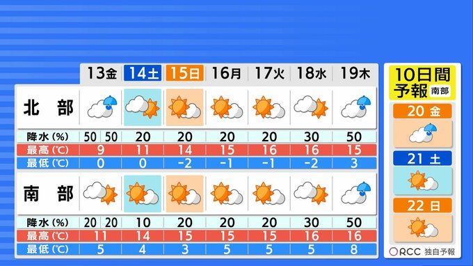 【あす3/13(金)広島天気 】不安定な空模様 北部中心に雪やみぞれ 南部晴れ間 北風冷たく冬の寒さ 2026年3月12日(木) 19:02 国内 天気 しばらく一日の寒暖差に注意 あさって以降来週水曜日頃にかけておおむね晴れて日差しが暖かいでしょう。日中の気温は平年並からやや高い日が多く、この時期らし春の陽気になるでしょう。北部や内陸部を中心に一日の寒暖差がかなり大きくなるため体調管理にはご注意ください。