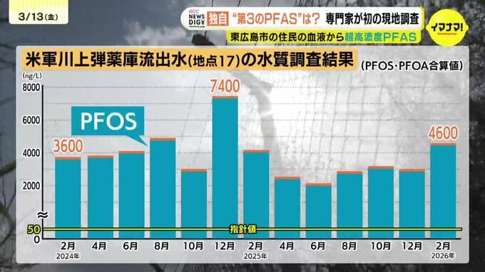 河川では、弾薬庫の敷地から水がしみ出す場所でPFASの値が最も高く、指針値の42~148倍の間で増減を繰り返しています。