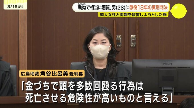 その上で、角谷裁判長は、「犯行動機は極めて身勝手かつ自己中心的で、経緯動機に酌量すべき点は全くない」とする一方で、「計画段階で女性の殺害については具体的な方法までは考えおらず、これを超える計画的な犯行とまではいえない」などとし、懲役13年の実刑判決を言い渡しました。