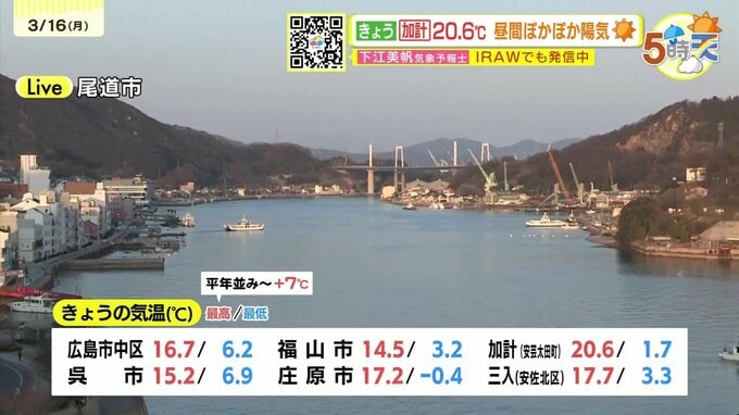 きょう16日(月)の広島県内は、朝からよく晴れて昼間はぽかぽか陽気になりました。最高気温は、加計で20.6℃ 広島市中区で16.7℃など、春本番の陽気になりました。