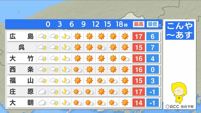 最低気温は、けさと同じくらいの地点が多いでしょう。北部や内陸部を中心に氷点下の冷え込みになる見込みです。暖かくしてお休みください。一方日中の気温は15℃を超える地点が多く、あすも日差しが暖かいでしょう。一日の寒暖差がかなり大きいですので、脱ぎ着しやすい服装でお過ごしください。