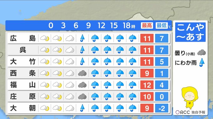 【あす3/18(水)広島天気 】広く本降りの雨に 冬の寒さに逆戻り 冬物活躍する一日 2026年3月17日(火) 18:48 国内 天気 冬の寒さに逆戻り 防寒対策しっかり あすは冷たい雨となり、朝から気温があまり上がりません。最高気温は、沿岸部で10℃~12℃くらい きょうより5℃前後低いところが多いでしょう。あすは一時的に冬の寒さに戻ります。冬物のコートやダウンを使い、暖かくしてお過ごしください。