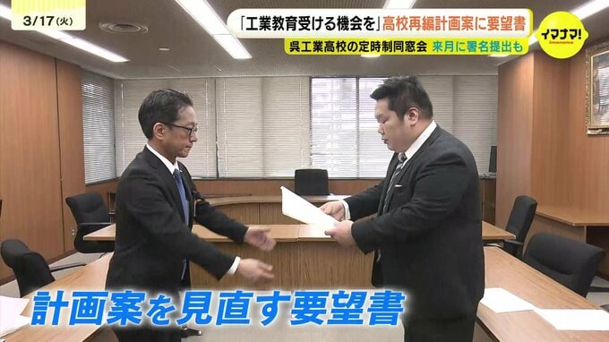 広島県教委による県立高校の再編計画案について、呉工業高校の定時制同窓会が見直しを求める要望書を提出しました。