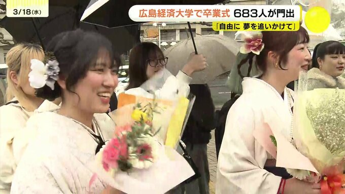 上野学園ホールで行われたのは、広島経済大学の卒業式です。広島経済大学では大学生と大学院生、683人が卒業します。卒業生は袴やスーツに身を包み、式に出席しました。石田優子学長からは「自分らしく、自由に、夢を追いかけて生きていってください」と祝福の言葉が送られました。