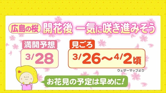 広島ではきょう(3月19日)桜の開花発表がありました。平年より6日早く、過去2番目に早い発表となりました。3月19日に発表があったのは、過去には2023年3月19日で、2023年以来の発表となっています。
