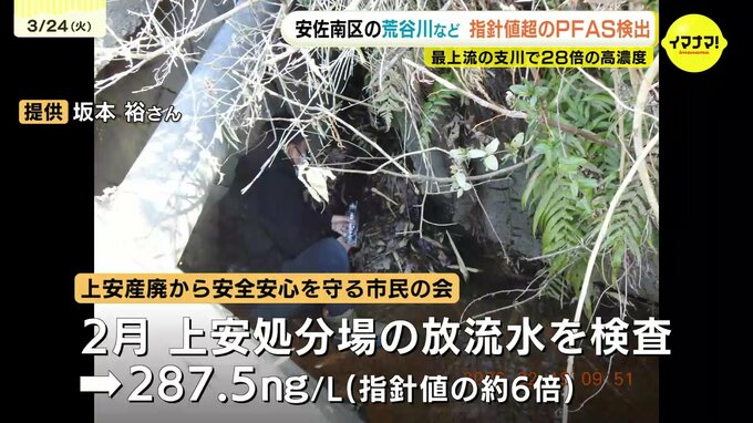 2月に上安処分場の放流水が流れ込む水路の水を市民が自費で検査した結果、指針値の6倍程度のPFASが検出されていました。
