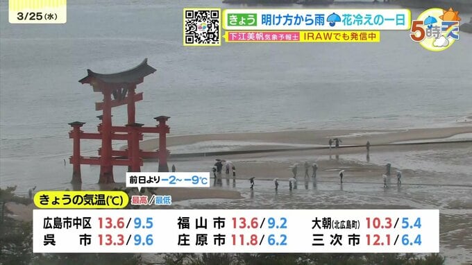 きょう25日(水)の広島県内は、明け方から雨が降り、北風がひんやり寒い一日になりました。最高気温は、広島市中区・福山で13.6℃ 呉13.3℃など、各地きのうと比べると2℃~9℃ほど低くなりました。
