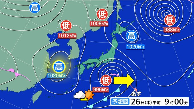 低気圧や前線は東へ遠ざかり、雨はこんや遅くには止むでしょう。遅くても明け方には雨が止み、朝から晴れ間が広がる予想です。高気圧に覆われ、午後ほどよく晴れるでしょう。