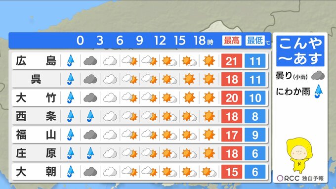 日中は日差しがたっぷり届き、広島市中区の予想最高気温は21℃ 上着いらずの暖かさになるでしょう。気温変化が短期間にかなり大きいので、体調管理にはご注意ください。また、夜遅くにかけて大幅に気温が下がる予想です。脱ぎ着しやすい服装でお過ごしください。