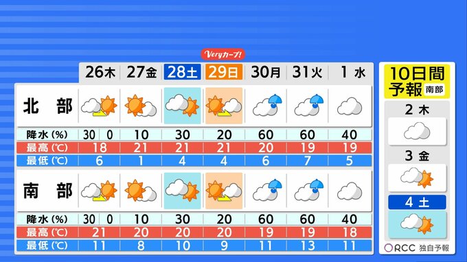 この先は周期的な天気変化になる見込みです。日中の気温は平年を上回る日が多く、20℃を超える日もある予想です。最低気温は沿岸部で10℃を下回らない日が多く、冷え込みは少し緩みそうです。春本番の陽気が続きますが、北部や内陸部を中心に一日の寒暖差が大きいため、体調管理にはご注意ください。