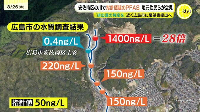広島市は24日、安佐南区の荒谷川など4カ所で最大で指針値の28倍に当たるPFASが検出されたと発表しました。