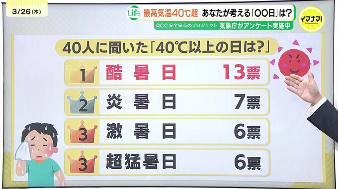 番組が独自に街の人40人に聞いたところ、13票を集めて第1位となったのは「酷暑日」でした。