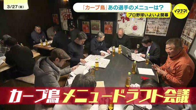 さあ、ことしもこの季節がやってきました。広島市内13店舗の代表が集結。恒例の「カープ鳥メニュードラフト会議」。木下富雄さんや長内孝さん、往年の名選手も顔をそろえました!今年の注目は、期待のルーキー3人です!