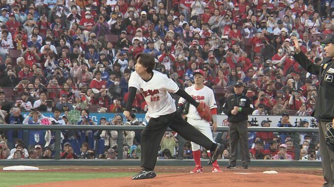 阿部さんは、背番号「122」のカープユニフォームに身を包み、マウンドへ。