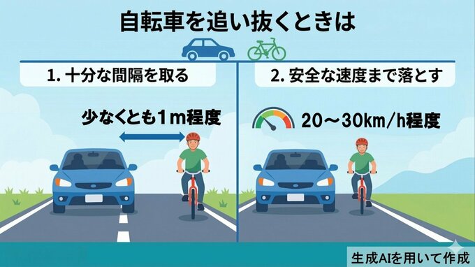 しかし、この条件だと交通量が多く車の流れが速い幹線道路などを自転車が走っている場合、追い越せずに大渋滞が生じることがあるのではないでしょうか?