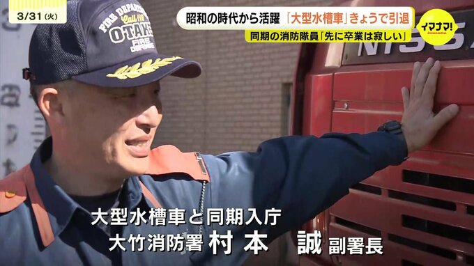 大竹消防署の村本誠副署長は「実は水槽車と同級生になる」と話します。村本さんは1988年、この車が配備されるのと同じ時期に消防隊員になりました。38年間を共にしたなか一番印象に残っていることは、2011年の東日本大震災だそうです。