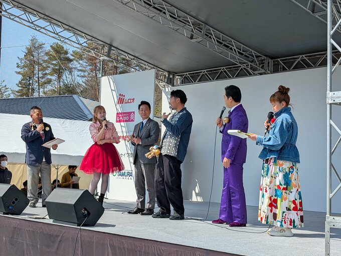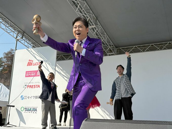 ステージには、演歌歌手の三山ひろしさんが、けん玉柄の鮮やかな紫色のスーツ姿で金色のけん玉を手に登場。紅白歌合戦での経験を交え、「鼻で息を吸って脳みそに酸素を送り、玉に息をかける」というメンタル管理のアドバイスを披露し、会場を沸かせました。