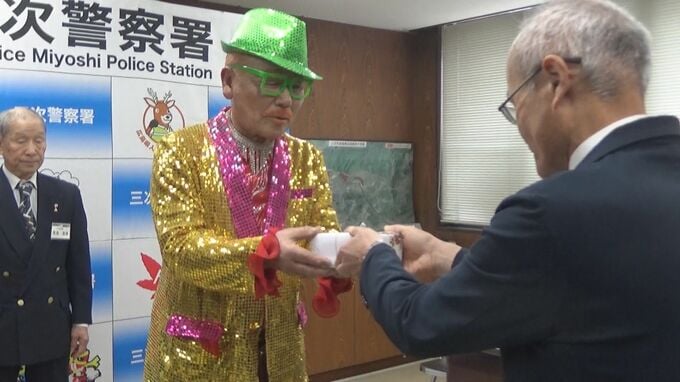 広島県三次市で地域の防犯や交通安全に貢献したボランティアたちに、警察から感謝状が贈られました。その中には異彩を放つ派手な衣装に身を包んだ一人のマジシャンがいました。