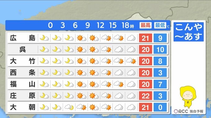 【あす4/3(金)広島天気 】貴重な日差し 洗濯・お花見チャンス 春本番の陽気 2026年4月2日(木) 19:11 国内 天気 日中20℃超え地点も 上着いらずの暖かさ 最低気温は、北部や内陸部ではけさより5℃ほど低くなるでしょう。朝晩と日中との気温差にご注意ください。日中の気温は、きょうより5℃ほど高くなる地点が多く、昼間は上着いらずの暖かさになるでしょう。