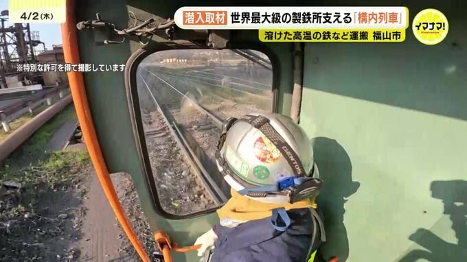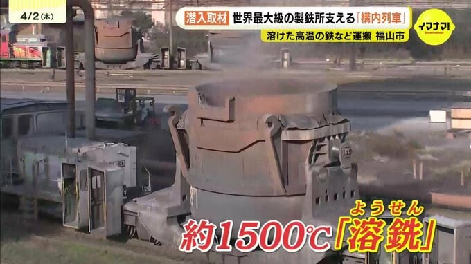 こちらがきょうの主役、「構内鉄道」です。機関車が牽引しているこちらの巨大な鍋。鉄鉱石を溶かした約1500度の「溶銑」が入っています。重さは220㌧。鍋自体の重さも合わせると1つ300㌧にもなります。