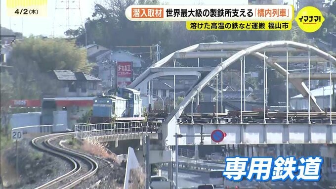 鉄道のレールを出荷するために、製鉄所から東福山駅まで全長3・6kmの専用鉄道も備えています。この日も、レールが列車に乗せられ、運ばれていきました。