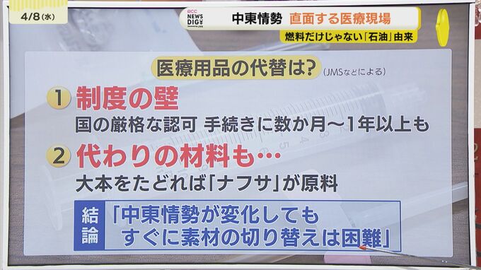 医療用品には「制度の壁」があり、安全性を証明する国の認可手続きには数か月から1年以上かかるため、中東情勢が変化したからといって、すぐに石油以外の素材へ切り替えることは困難です。