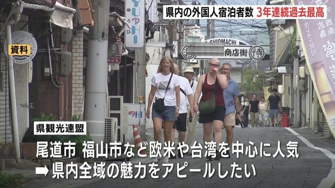 また、尾道市や福山市など広島市以外の地域も欧米や台湾を中心に人気になっていることなどから、今後さらに県内全域の魅力をアピールし、外国人宿泊数を増やしていきたいとしています。