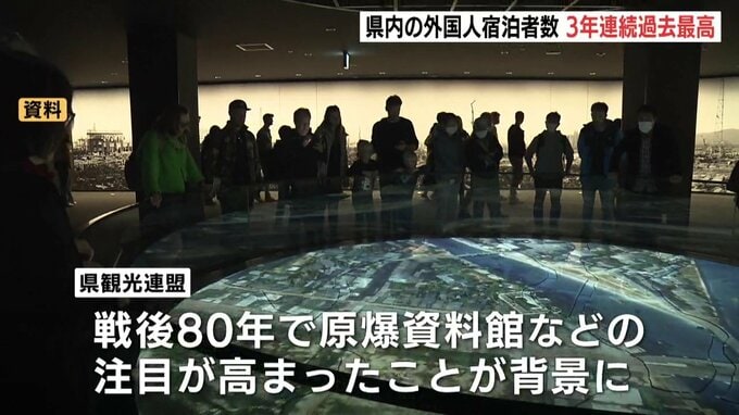 出身地域別では欧米やオーストラリアが半数を超えていて、全国の傾向と比べると東アジアの割合が低くなっています。県観光連盟は戦後80年で原爆資料館などの注目が高まったことが背景にあるとみています。