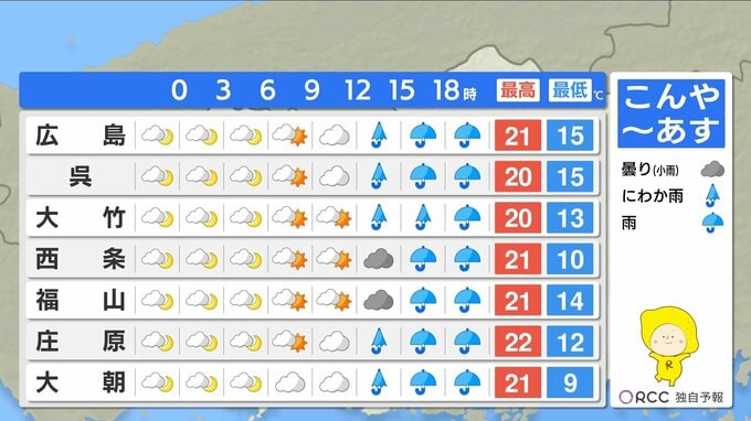 【あす4/14(火)広島天気 】 雲が優勢 午前中は晴れ間も午後は雨 お出かけには傘を 2026年4月13日(月) 19:01 国内 天気 朝晩の冷え込み緩む 上着いらずの陽気つづく けさと同じように沿岸部では朝の冷え込みはほとんどありません。朝晩も過ごしやすいでしょう。日中の気温は20℃以上の地点が多く、あすも上着いらずの暖かさになるでしょう。数字としてはきょうより2℃~4℃ほど低くなる予想です。