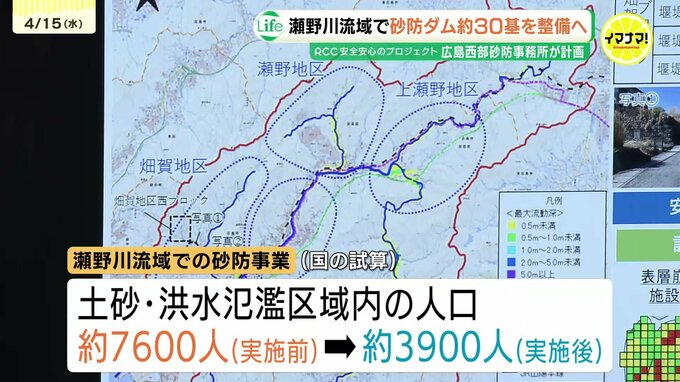 国の試算では、砂防ダムが完成すれば土砂や洪水で被害を受ける人口が、約7600人から約3900人まで減らせるとしています。