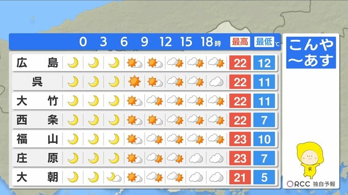 最低気温は、けさより3℃~5℃ほど低くなり、北部や内陸部を中心に冷え込みがやや強まるでしょう。厚手の上着の出番になりそうです。日中の気温は20℃を大きく超える地点が多く、きょうより低くなりますが、それでも上着いらずの陽気が続くでしょう。