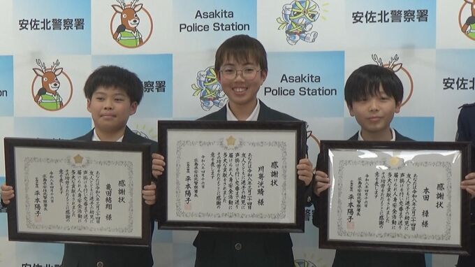 感謝状が贈られたのは、当時小学6年生で、今は広島市立日浦中学校1年生の亀田結翔さん、川崎洸晴さん、本田禄さんです。