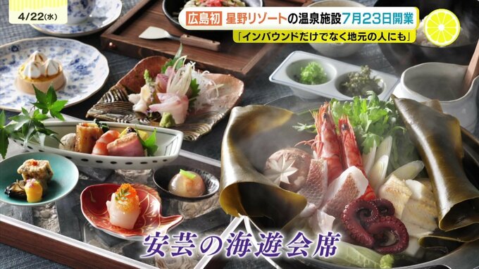 コンセプトは「見晴らしの湯で、いつくしみの凪逗留」。鎌倉時代に起源を持つとされる瀬戸内の「石風呂」を再現しています。また、レモンやカキ、お好み焼きなど広島の食文化にちなんだ会席料理「安芸の海遊会席」も紹介されました。