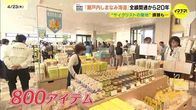 瀬戸田パーキングエリア限定の島や波をイメージしたバウムクーヘンや、今治のタオルなど、広島と愛媛の800アイテムの土産物などの商品がところ狭しと並んでいます。