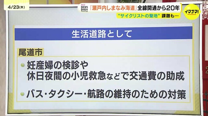 観光利用の一方で、生活道路としても欠かせないしまなみ海道。利便性向上に向けた模索が続きます。