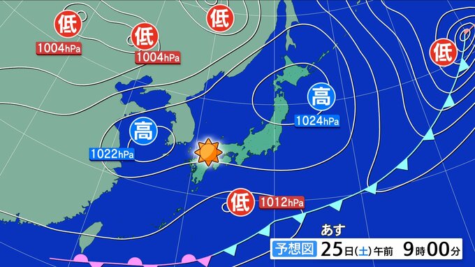 25日(土)は、前線が日本列島から離れ、高気圧に覆われてよく晴れるでしょう。晴れるため朝は冷えますが、日中は日差しがよく届き、25℃以上の夏日となるところがある見込みです。北部や内陸では、1日の寒暖差が20℃くらいになりそうです。
