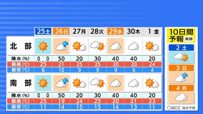 【4/25・26(土日)広島天気 】土曜はよく晴れて洗濯日和 黄砂・花粉・PM2.5少ない 日曜はぐずつく 2026年4月24日(金) 19:23 国内 天気 この先の10日間 水曜・木曜は雨 周期変化 27日(月)と28日(火)は晴れ間が広がり、29日(水・祝)と30日(木)はぐずつく予想です。日差しが届けば、25℃以上の夏日となるところがあるでしょう。ヒノキ花粉は収束に向かっています。