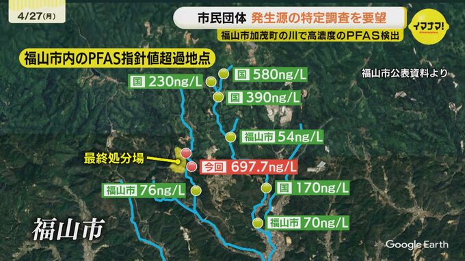 連絡会は、先月、福山市加茂町の谷尻川の上流と、その支川で独自に午前水質検査を行ったところ、1カ所で、指針値のおよそ14倍にあたる697.7ng/LのPFASが検出されたということです。これは、福山市内では最悪の濃度です。
