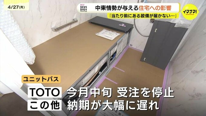 「お風呂は小さなパーツで組み立てているが、例えば水漏れを防ぐ『パッキン』などのプラスチックの原材料(ナフサ)がない。お風呂自体は完成していても、小さな部品がない」