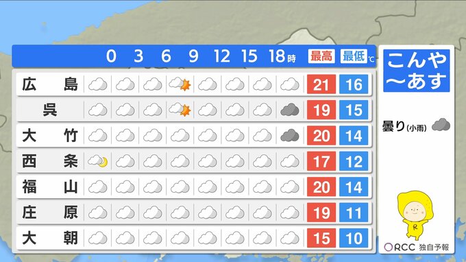 【あす4/29(水・祝)広島天気 】どんより曇り空 にわか雨の可能性 気温大幅ダウン 2026年4月28日(火) 18:50 国内 天気 気温大幅ダウン 昼間も上着必要 日中の気温は、きょうより大幅に低くなり、沿岸部で5℃~6℃ほど低く、北部や内陸部では7℃~10℃ほど低くなる見込みです。北風が吹いてきょうよりかなりひんやりするでしょう。薄着で風邪を引かないようご注意ください。
