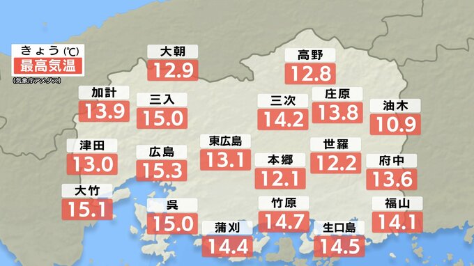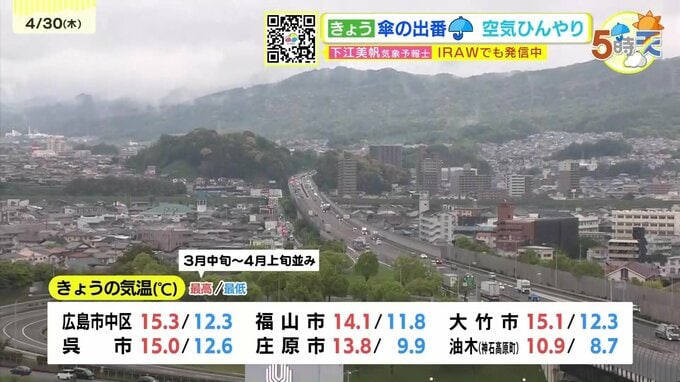 きょう30日(木)の広島県内は、断続的に雨が降り、降り方が強まった時間帯もありました。日中の気温は、きのうと比べて1℃~6℃ほど低くなり、3月中旬から4月上旬並の気温になりました。