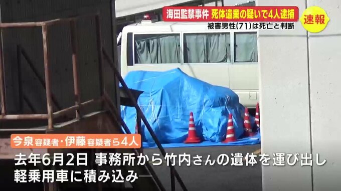 警察によりますと、4人は共謀し、去年6月2日、男性が使用していた事務所から男性の遺体を運び出し、事務所先に停止した軽乗用車に積み込み、翌3日までの間、その車を使用して、遺体を埼玉県内、またはその周辺まで運搬したうえ、隠すために、遺棄した疑いがもたれています。